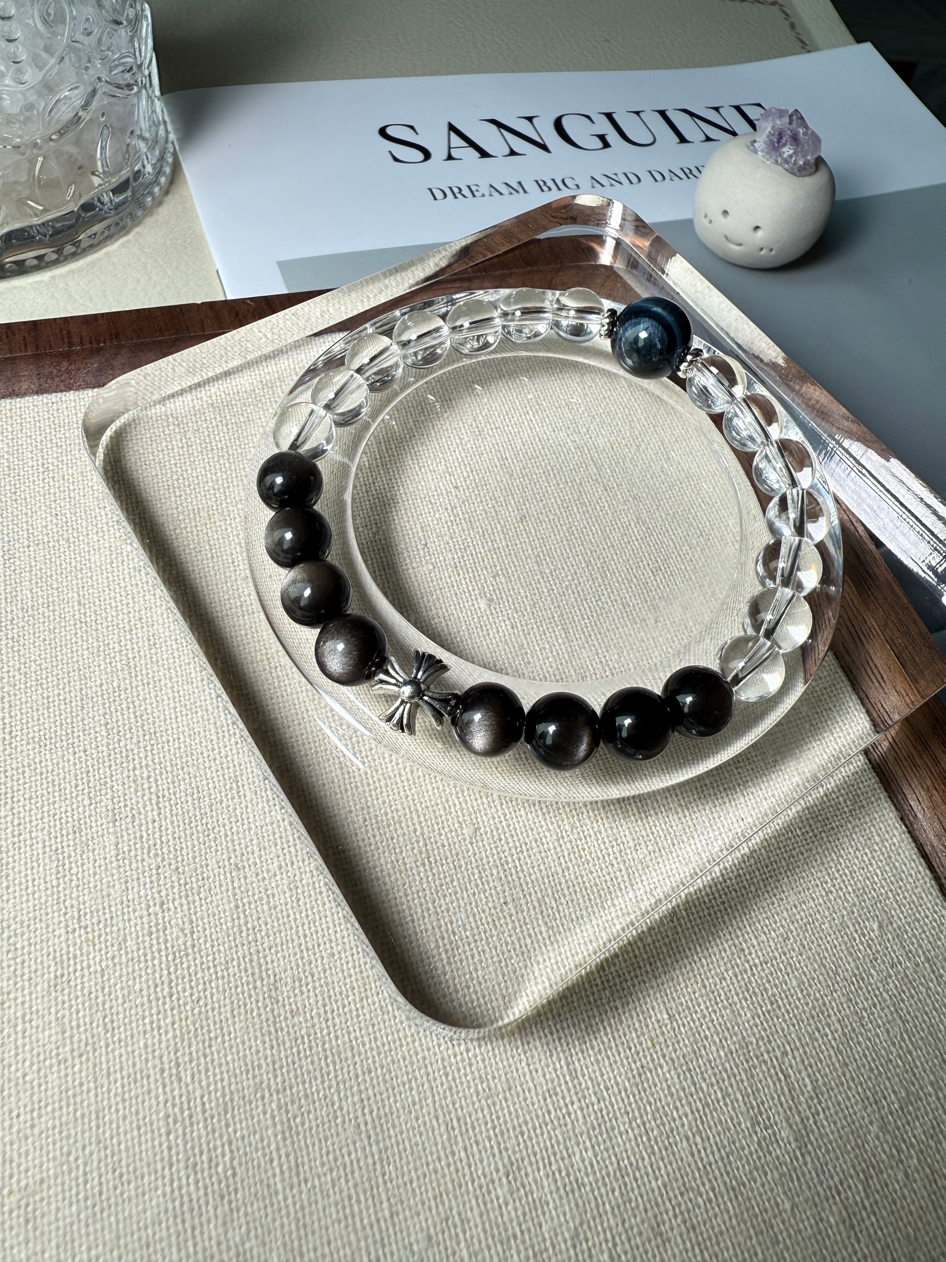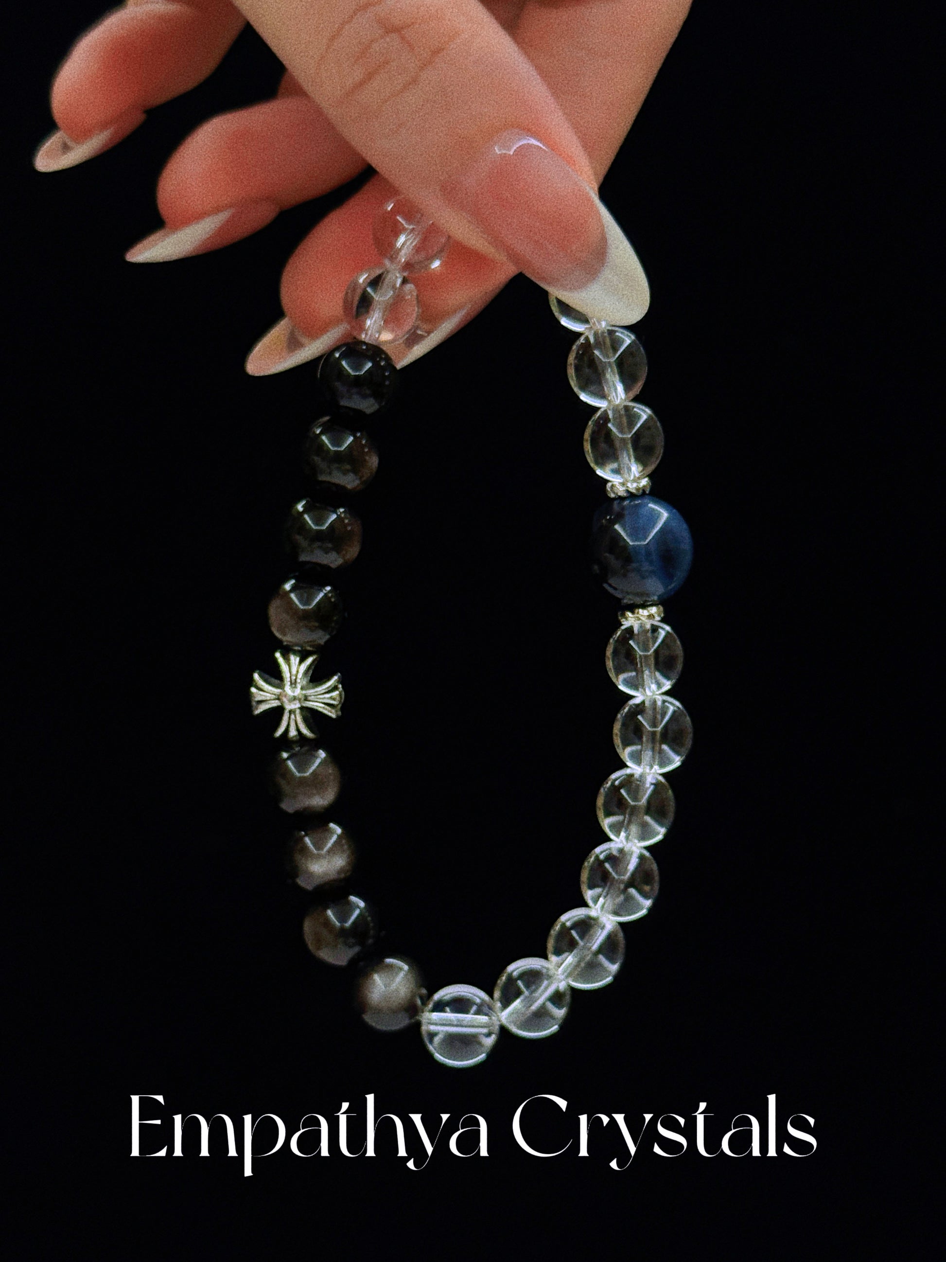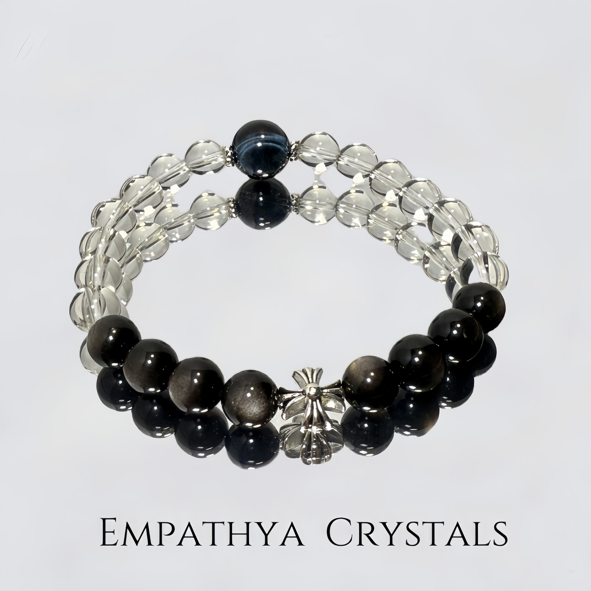 Cosmic Balance, crafted from 8mm silver obsidian, 10mm blue tiger's eye, and 8mm white quartz, is designed to relieve anxiety and enhance focus. This elegant piece is perfect for high-pressure professionals who need clarity and protection. The silver obsidian shields negative energy, while the blue tiger's eye sharpens attention. White quartz amplifies these effects, promoting mental sharpness. Ideal for those seeking balance and composure in demanding work environments, ensuring you stay grounded and focused.