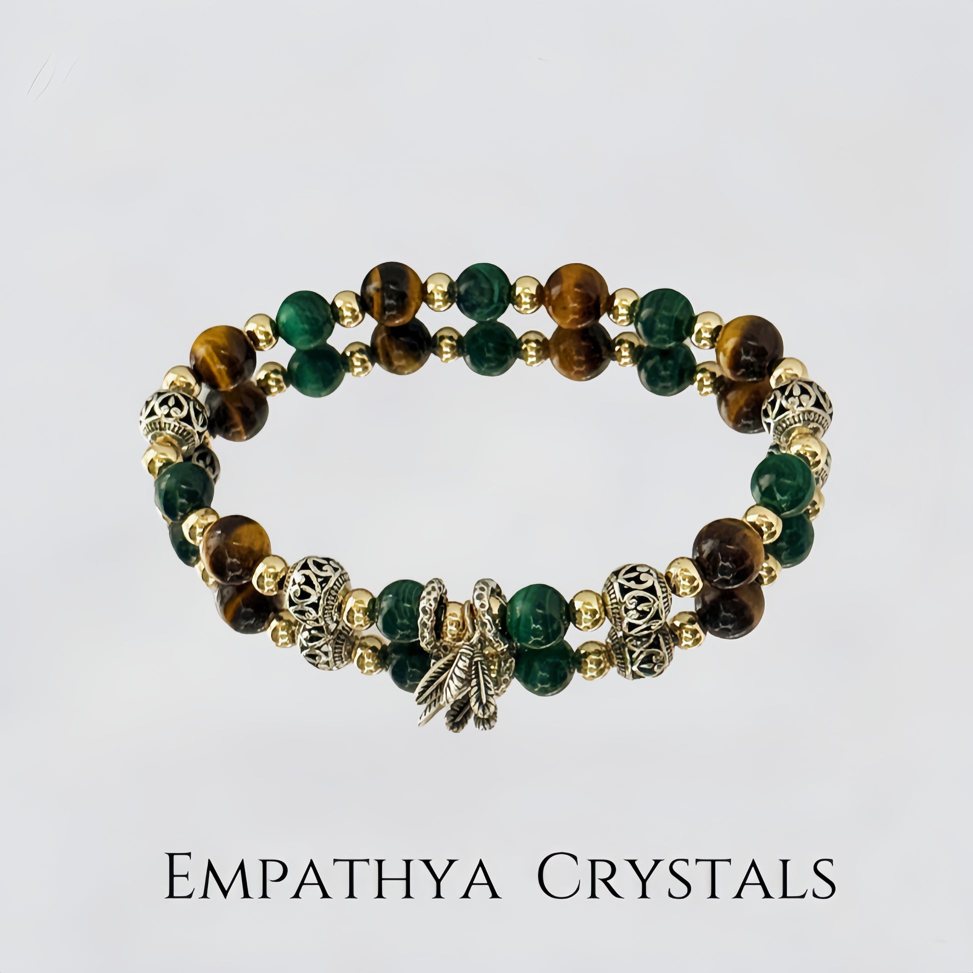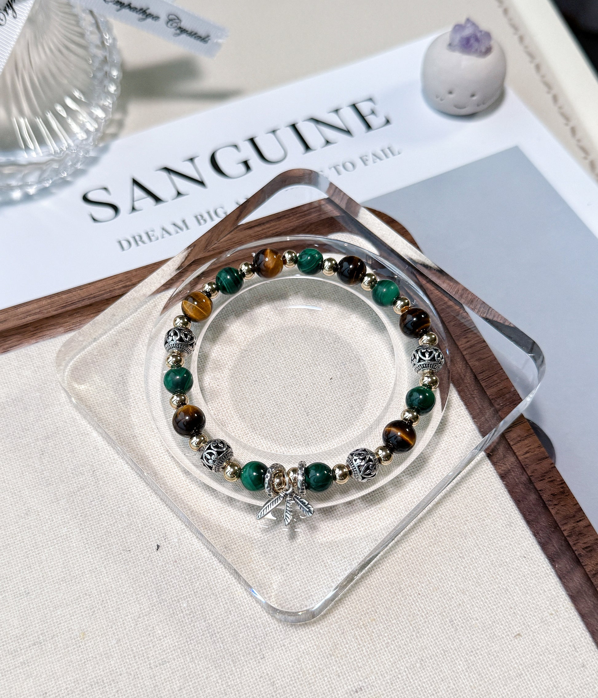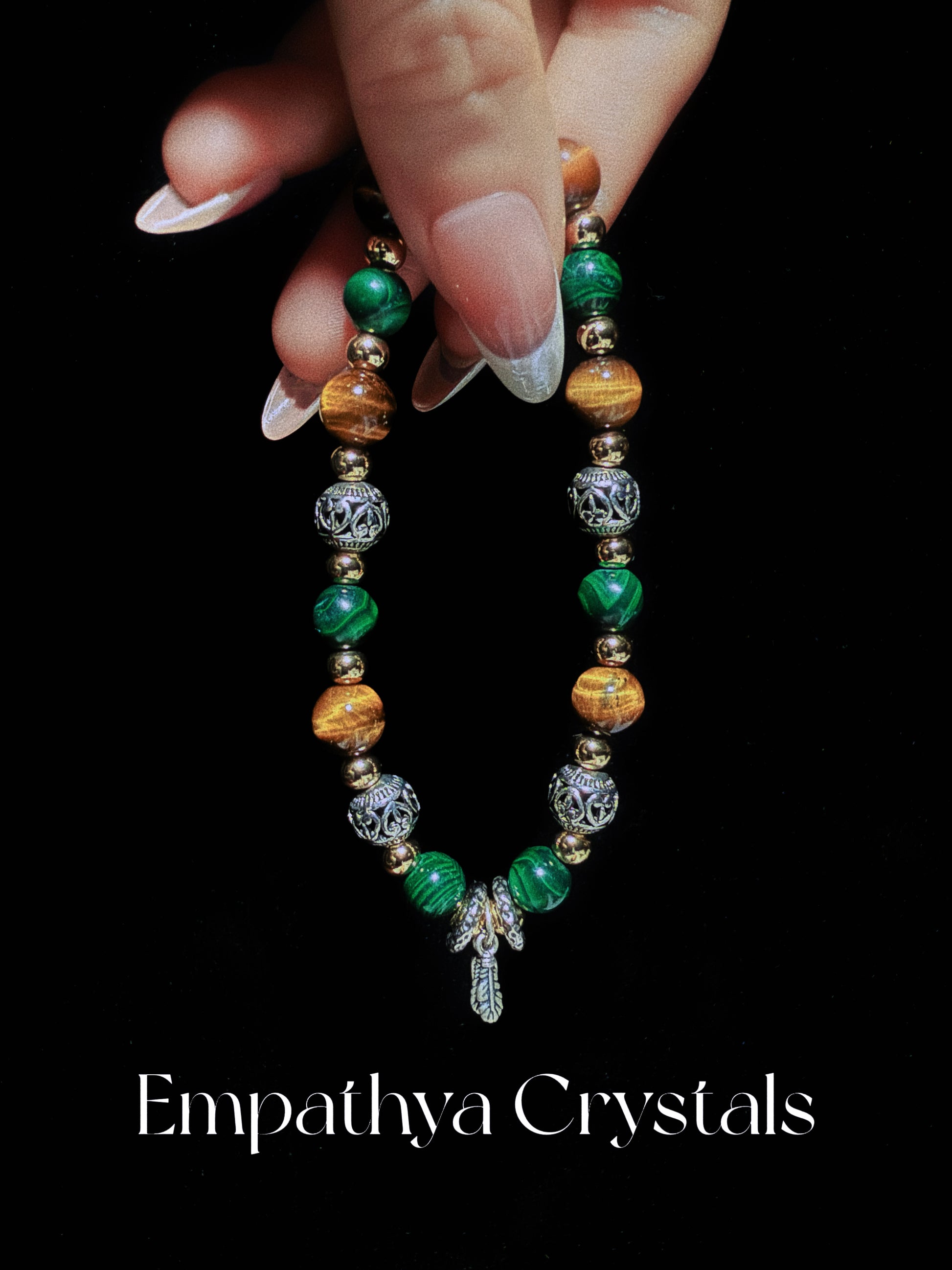 Fortune Whisperer, crafted from 7mm Malachite, 8mm Tiger's Eye, and silver accents, is perfect for individuals seeking emotional balance and confidence. It harmonizes the Heart and Solar Plexus Chakras, promoting inner peace and personal empowerment. This elegant piece is ideal for those in leadership roles or pursuing career growth, as it enhances focus and stability in professional settings. The calming and empowering energies of the necklace make it a perfect companion for meditation, business meetings, or any situation requiring a boost of confidence and emotional stability. Embrace the essence of Fortune Whisperer and let it guide you towards a balanced and prosperous life, fostering deeper connections and personal success.