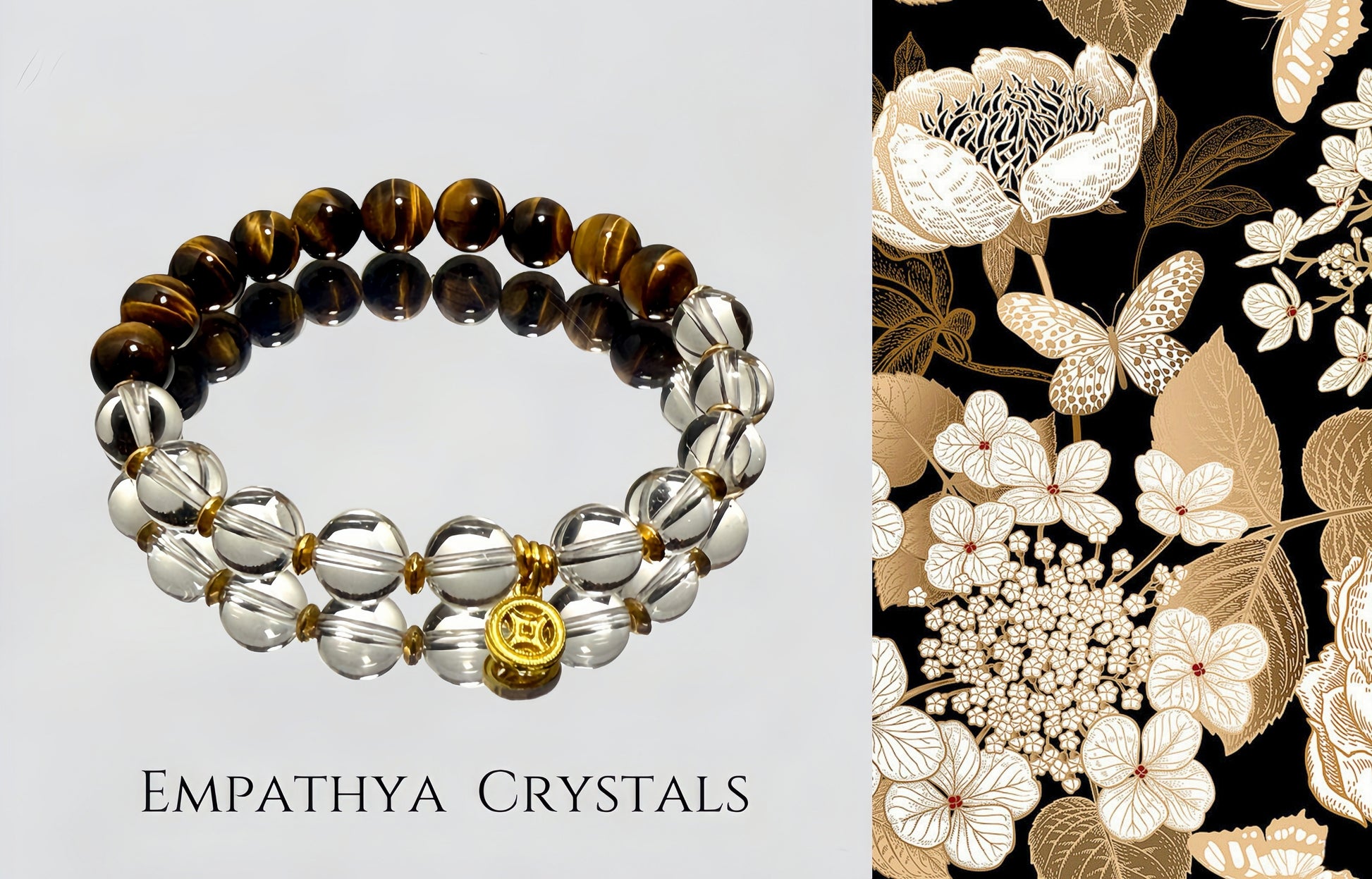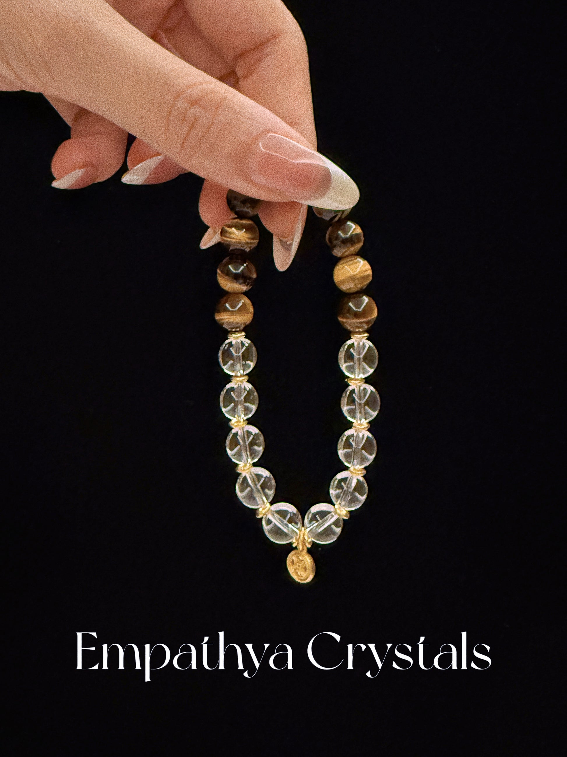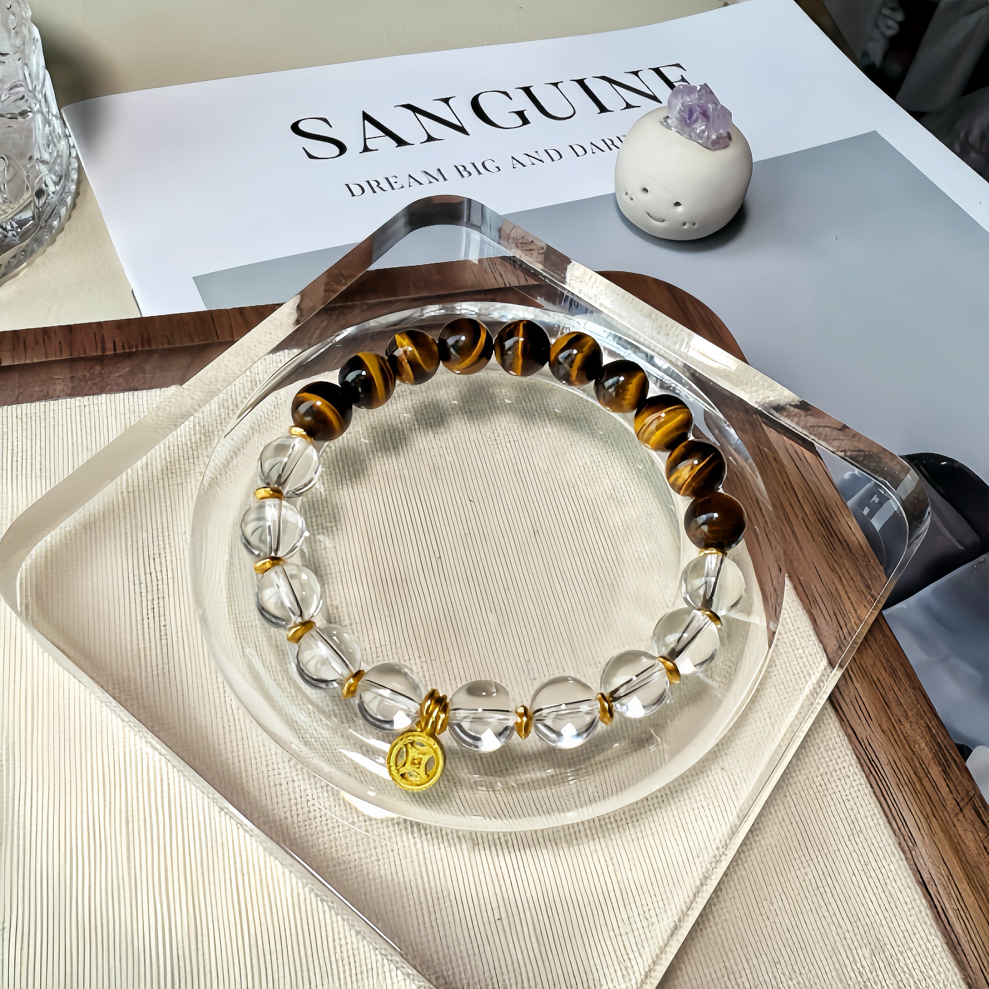 Guardian Aura, crafted from 8mm Tiger's Eye and 8mm White Quartz, enhances mental clarity and emotional stability. Tiger's Eye offers protective properties to ward off negative energies and boost confidence in decision-making, while White Quartz purifies the energy field, enhances focus, and alleviates stress. Together, they create balanced energy ideal for professionals in high-pressure fields (e.g., business, healthcare, law) or students facing exams. This piece helps maintain calmness and clarity, empowering wearers to navigate challenges with resilience and confidence.