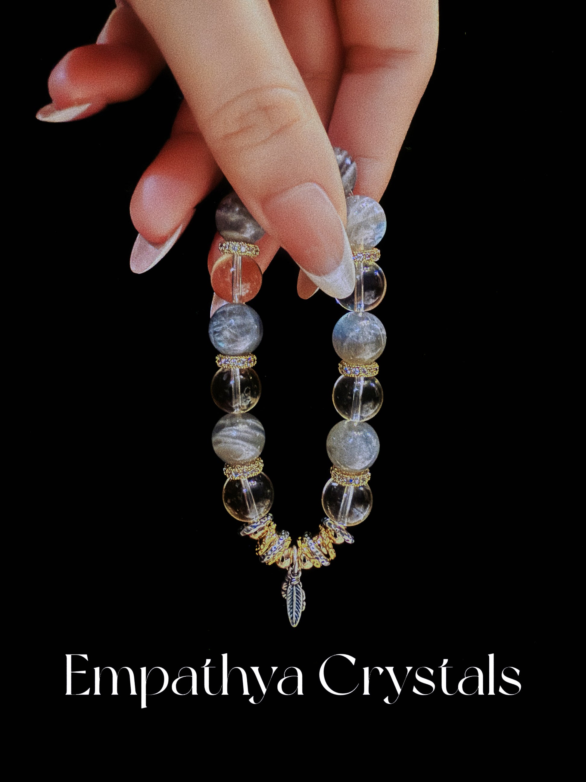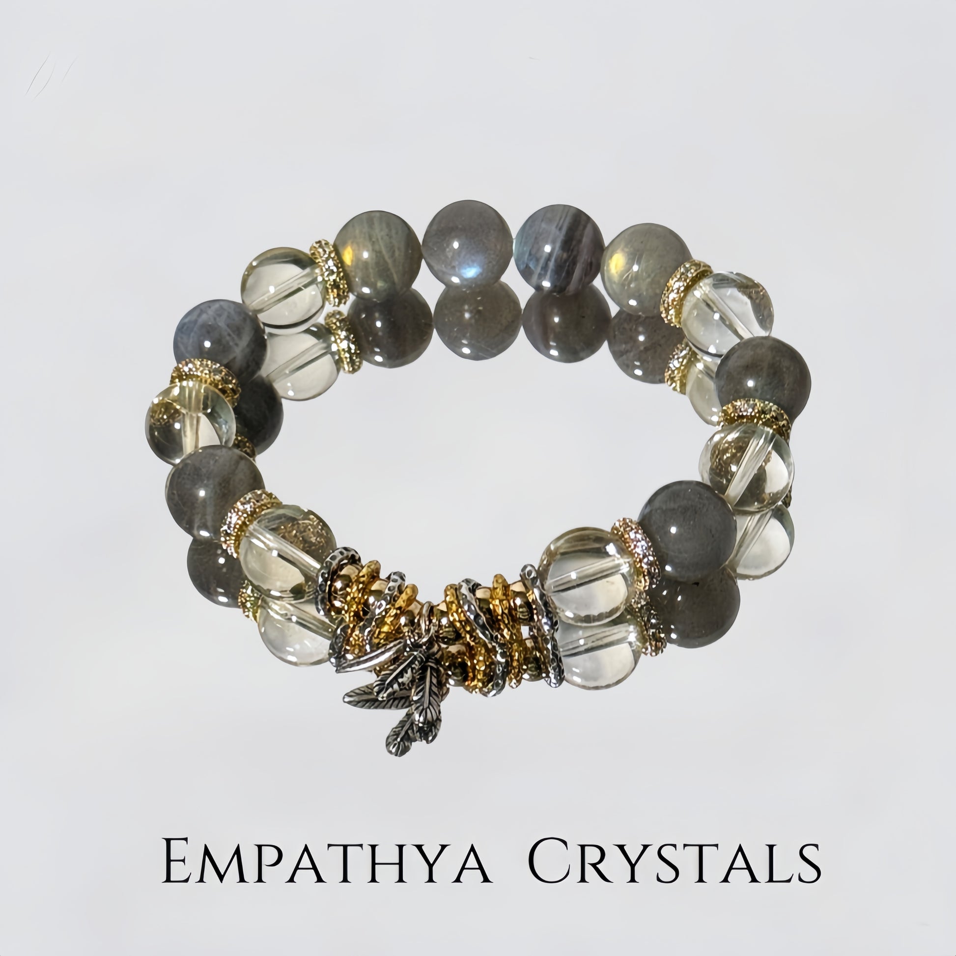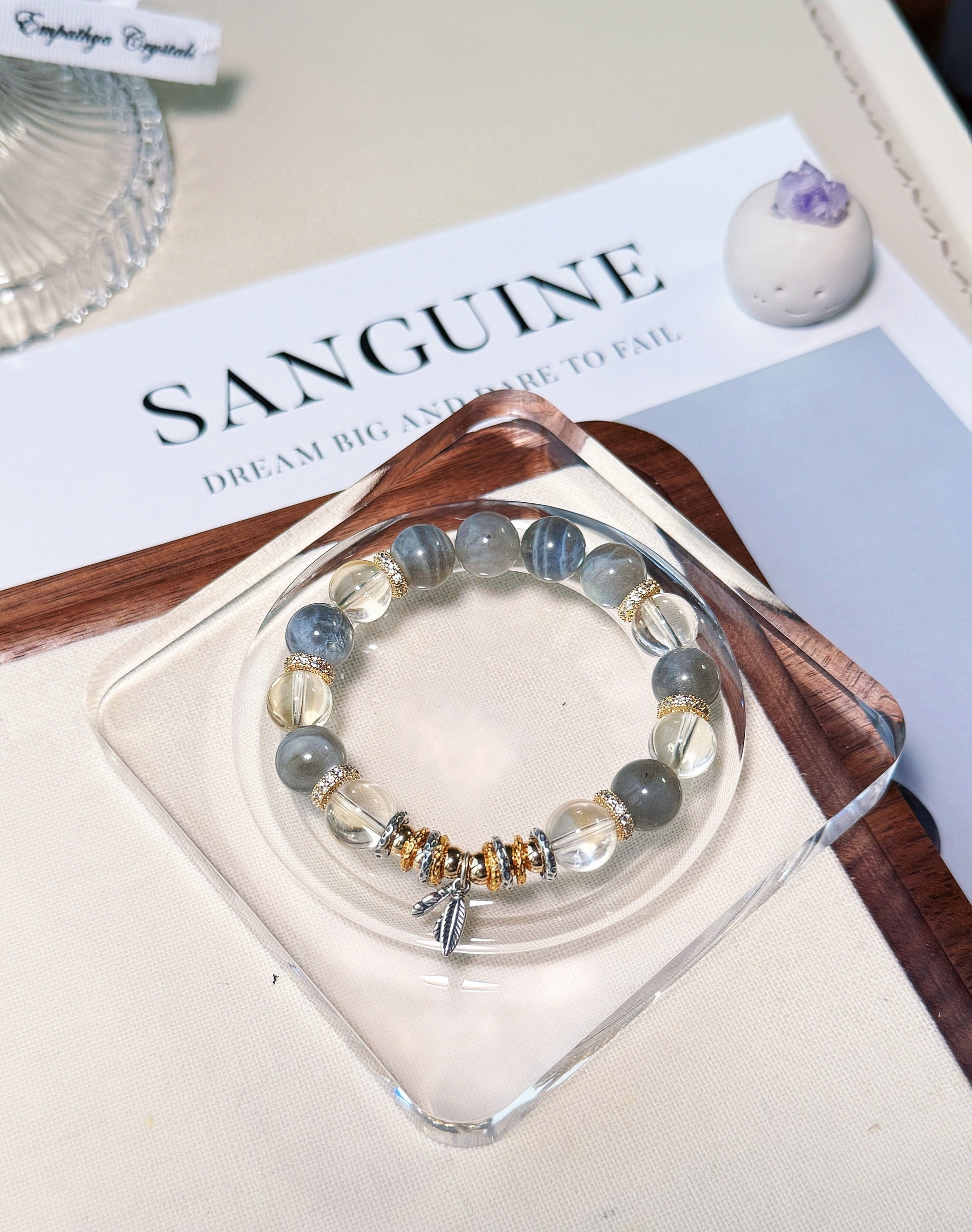 Intuitive Elegance, crafted from 10mm gray moonstone, 10mm white quartz, 10mm citrine, and silver feathers, is perfect for individuals seeking inner peace and enhanced intuition. This elegant bracelet harmonizes the calming properties of gray moonstone with the energizing effects of citrine, creating a powerful tool for emotional balance and spiritual clarity. The 925 silver feather charm symbolizes freedom and connection to higher realms, amplifying the bracelet's ability to foster inner calm and intuitive insights. Ideal for meditation and high-pressure environments, it helps maintain composure and insight, making it a valuable accessory for spiritual seekers and professionals who need to navigate life's challenges with serenity and heightened awareness.