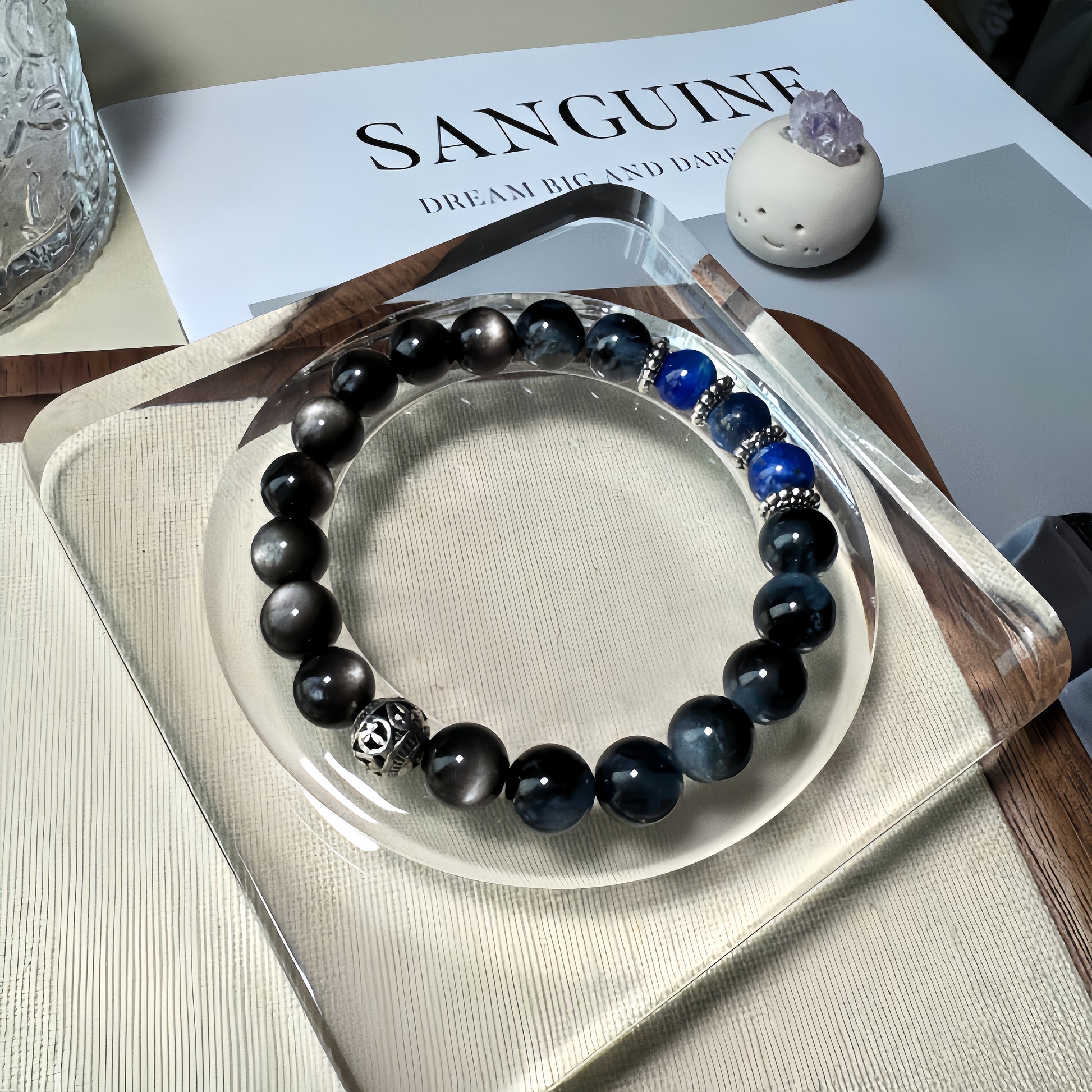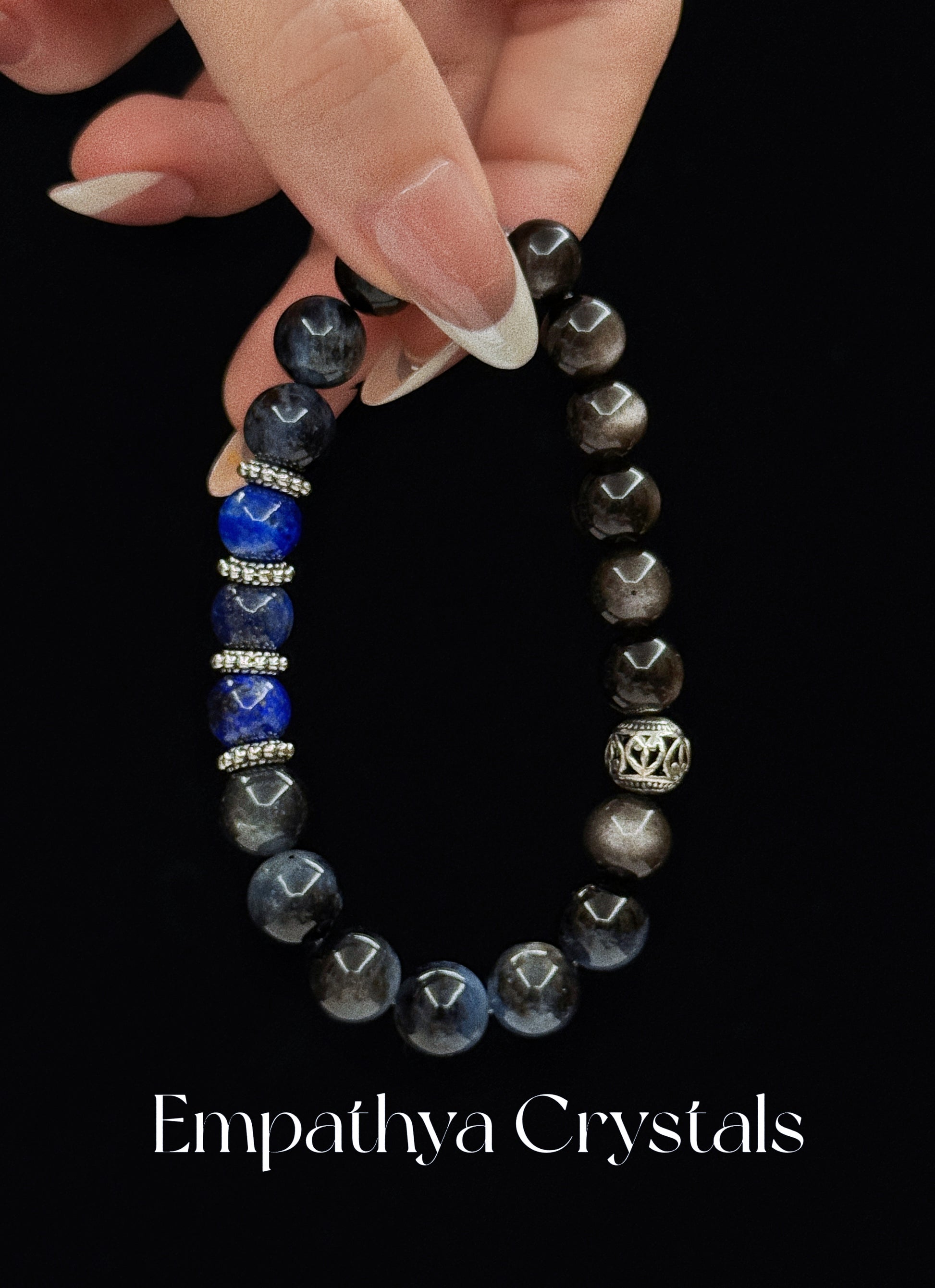 Sapphire Stars, crafted from 10mm Black Flash Aquamarine, 10mm Obsidian, and 10mm Lapis Lazuli, is ideal for those seeking calm and balance. The deep blue and black tones promote tranquility and reduce fatigue, resonating with the Water element. Silver accents symbolize Metal, enhancing communication and confidence. Perfect for busy individuals, it aids in stress relief and emotional well-being. Suitable for meditation, work, or social events, this bracelet helps maintain composure and elegance. Its harmonious blend of stones encourages relaxation and poise, making it a versatile accessory for both casual and formal settings.
